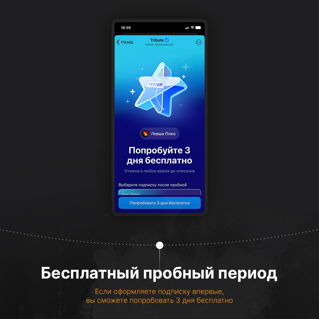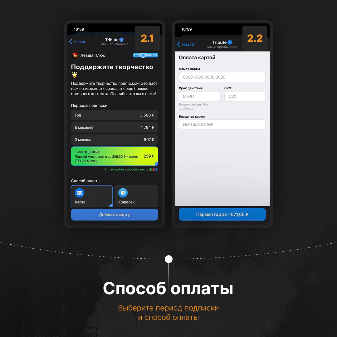 Перейдите по ссылке Подписка Левша ПЛЮС и оформите подписку через Telegram. Откроется окно Tribute — выберите способ оплаты и нажмите «Подписаться».